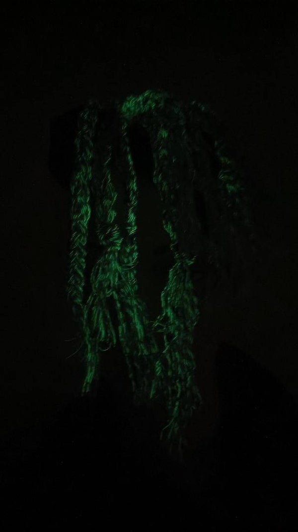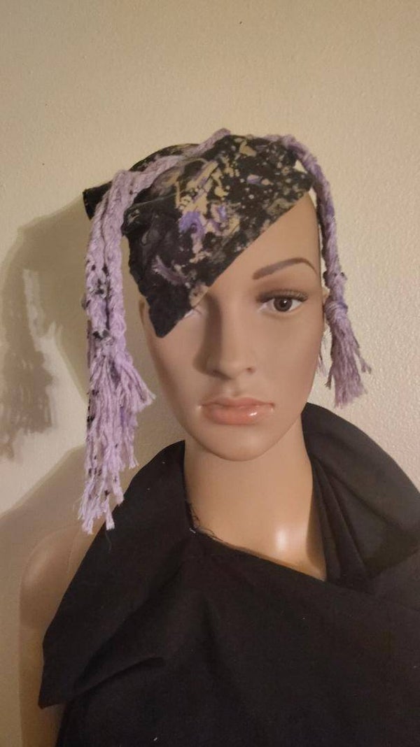 Girls purple braid hat is five to three inches in height has elastic band inside the at. 20 inches around the crown the braids glow in the dark
