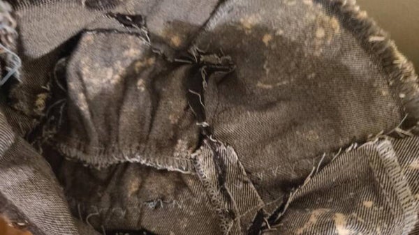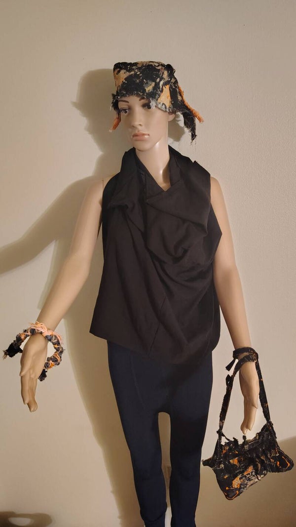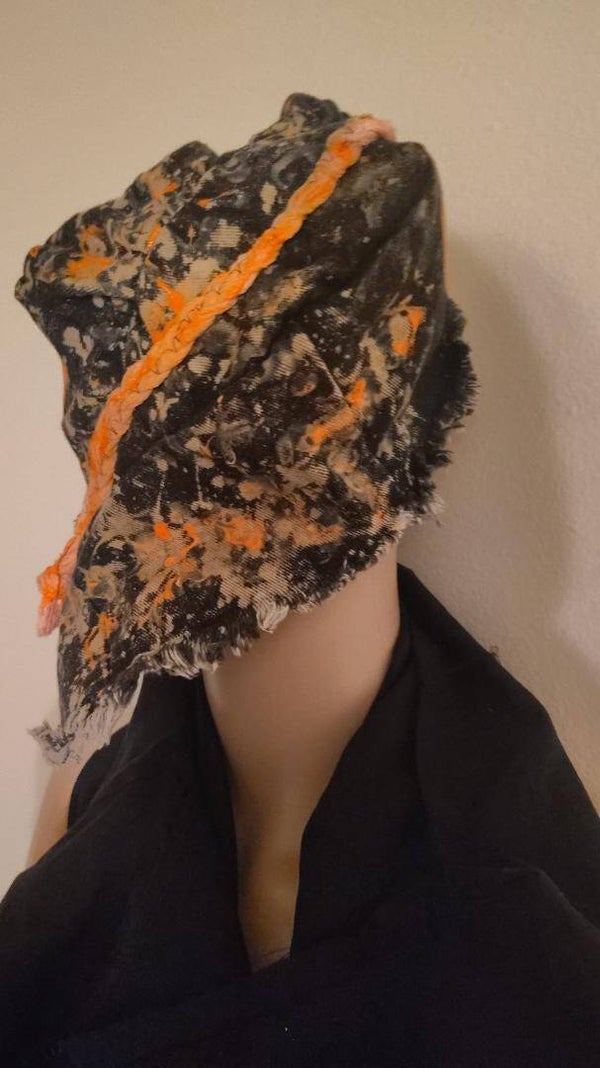 A jean hat and bracelet set called splattered orange the size of purse is 7 inches wide and 13 inches tall.